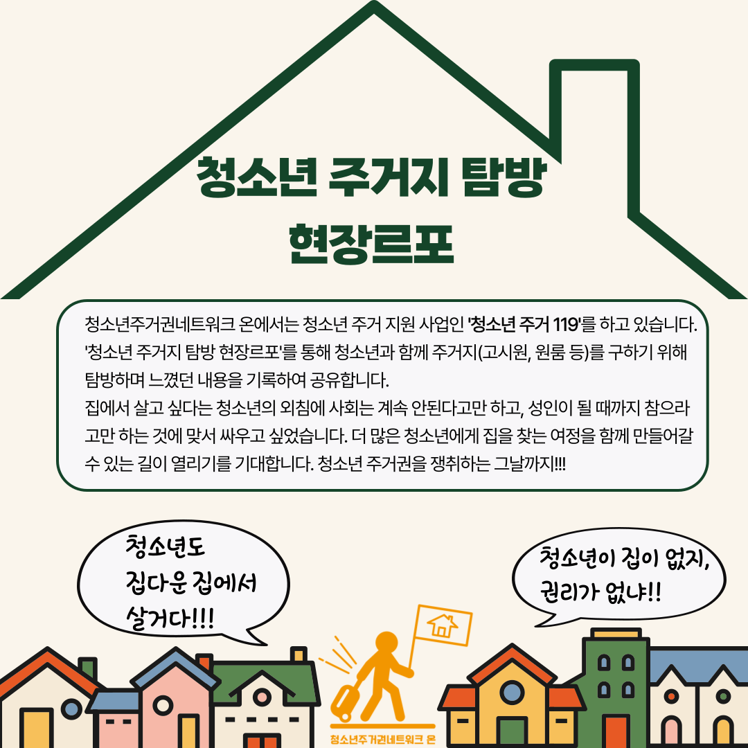 | 거리에서 청소년들을 만나며, 청소년에게도 ‘집다운 집’이 보장되어야 한다는 생각을 품은 곳은 청소년주거권네트워크 온만이 아닙니다. 각자의 현장에서 청소년의 주거권을 지키기 위해 고군분투하는 다양한 기관과 사람들이 있습니다. 이번 현장르포에서는 매일 서울 곳곳을 누비며 거리를 지키는 청소년일시쉼터 ‘더작은별’이 어떤 고민 속에서 청소년 주거지원을 시작하게 되었는지, 청소년들과 어떤 과정을 함께 겪으며 집을 구하고 일상을 살아내고 있는지를 담았습니다. 사업명처럼 청소년들에게 ‘집으로 가는 길을 밝혀주는 불’-가(집 家). 로(길 路). 등(등잔 燈)이 되어주는 더작은별의 이야기로 여러분을 초대합니다. |